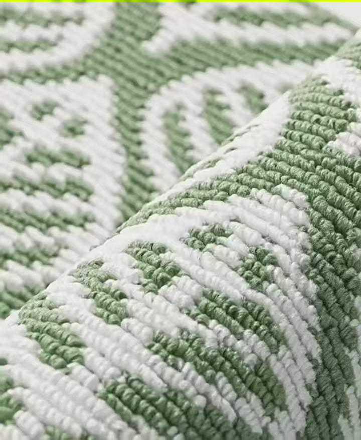 This bathroom rug is made with durable Polypropylene (Olefin) — a material perfectly suited for wet bathroom environments, thanks to its inherent traits: Its dense, tightly woven fiber structure works with a non-slip rubber backing to lock the rug in place on tile floors; the fibers themselves don’t stretch or shift when wet, so you get steady footing right after a shower. Polypropylene is naturally water-repellent — it doesn’t absorb moisture like some fibers, so water sits on the surface and dries fast, stopping mold, mildew, or stale odors from taking hold. And because the fiber’s smooth surface resists stains and grime buildup, wiping away water spots takes little effort; it also holds up well in the washing machine, so keeping the rug clean never feels like extra work.